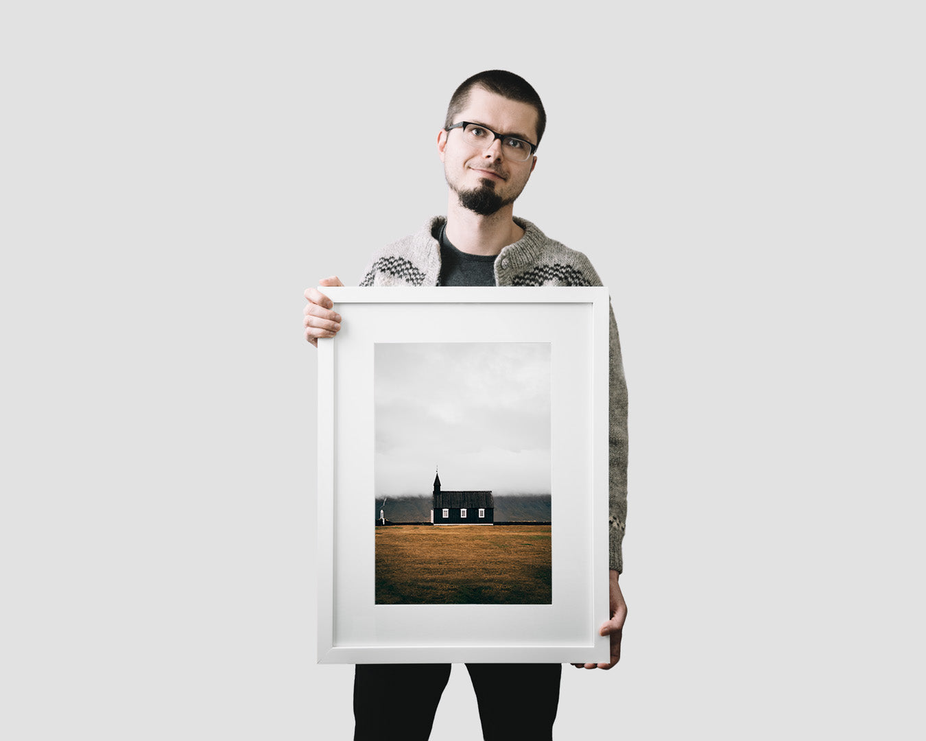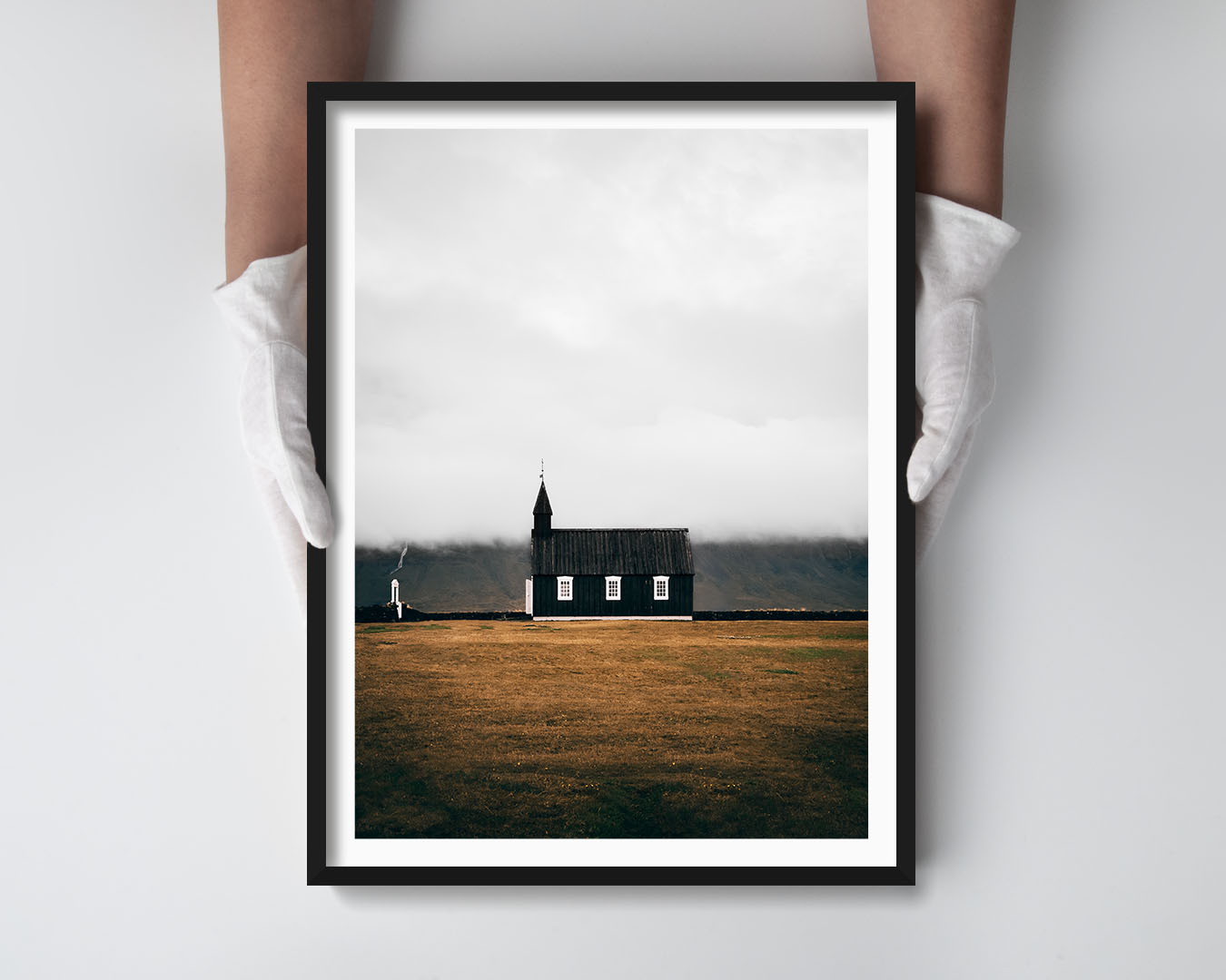Luxury, museum-quality, real fine art photography print (signed by the artist, with a certificate of authenticity) by Adam Biernat, an award-winning photographer published in the top Icelandic magazines. It features a small, pitch-black church in Búðir, Iceland.