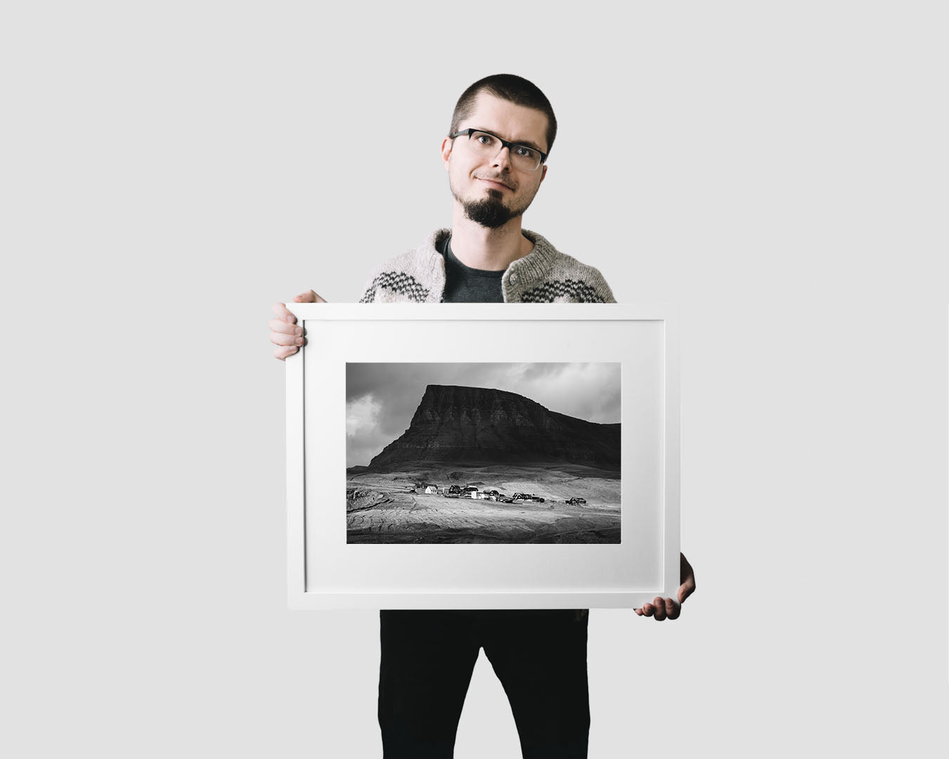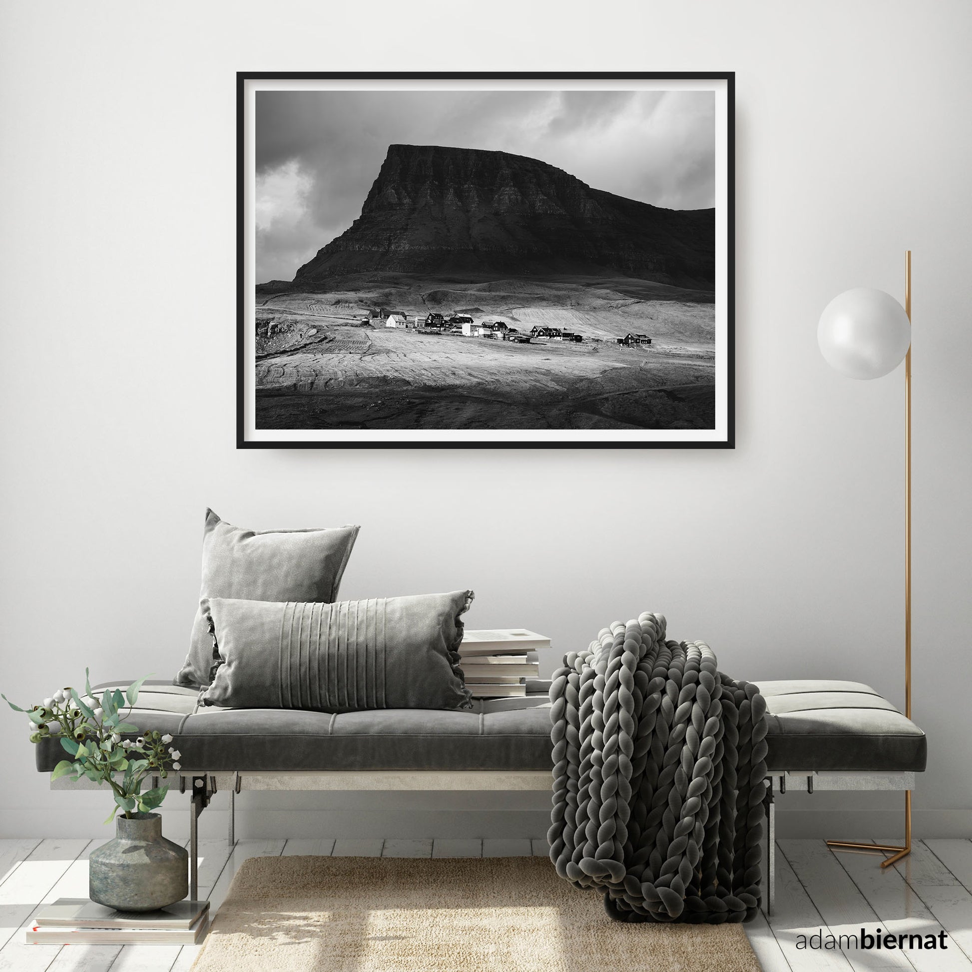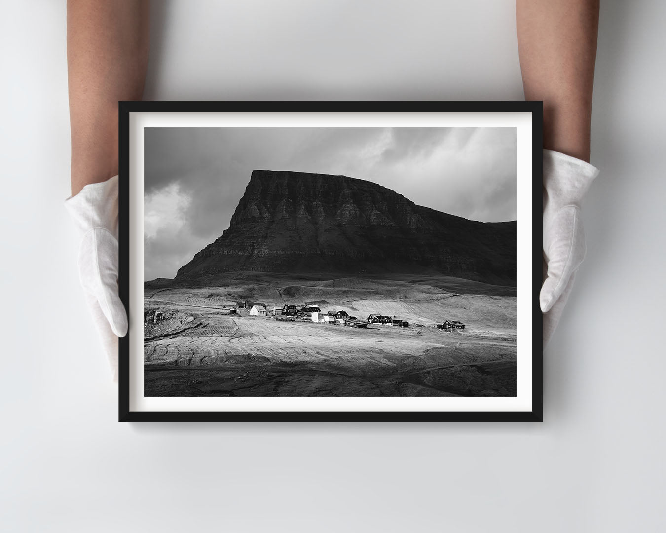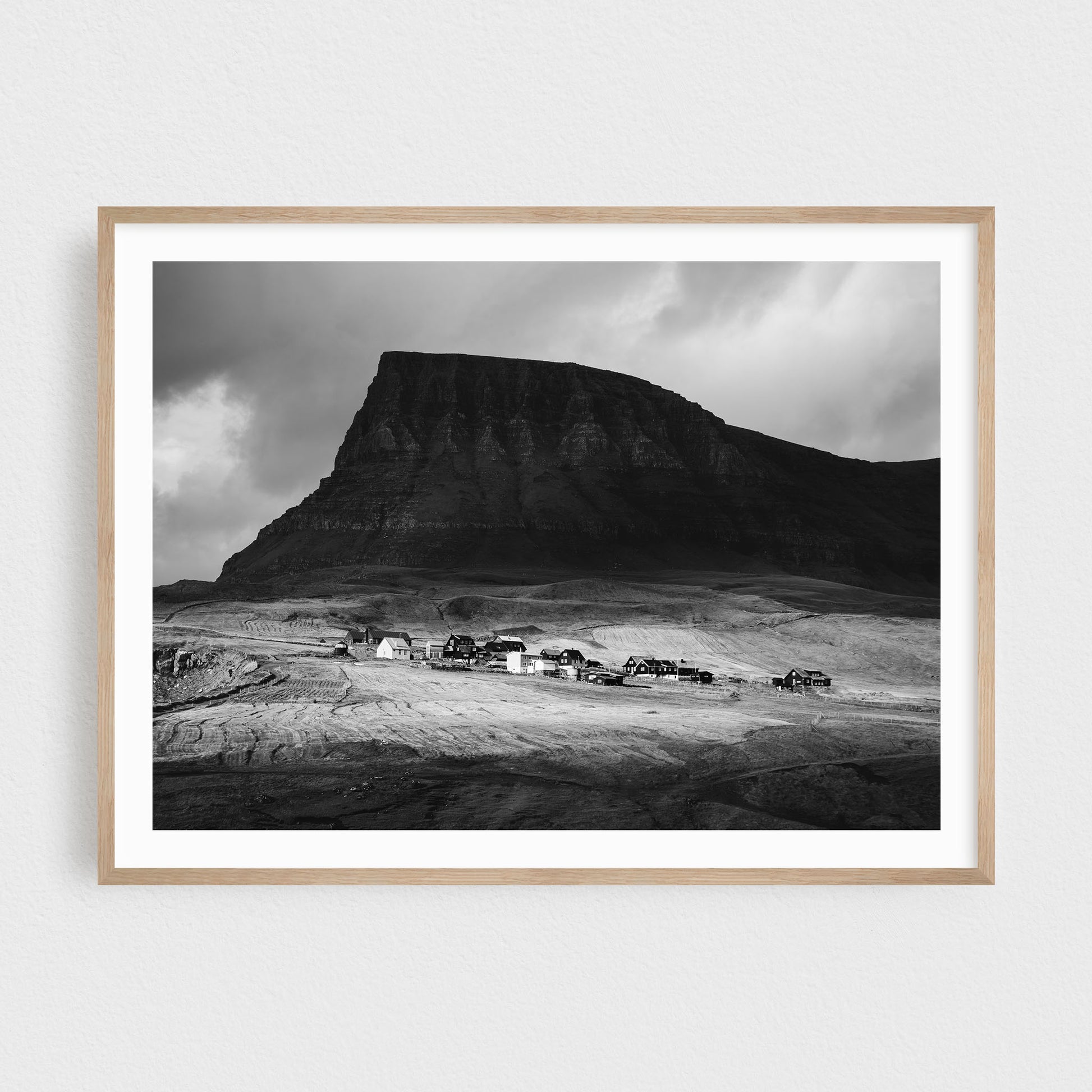 Luxury, museum-quality, real fine art photography print (signed by the artist, with a certificate of authenticity) by Adam Biernat, an award-winning photographer published in the top Icelandic magazines. It features a village of Gásadalur, Faroe Islands, situated at the foot of a steep mountain.