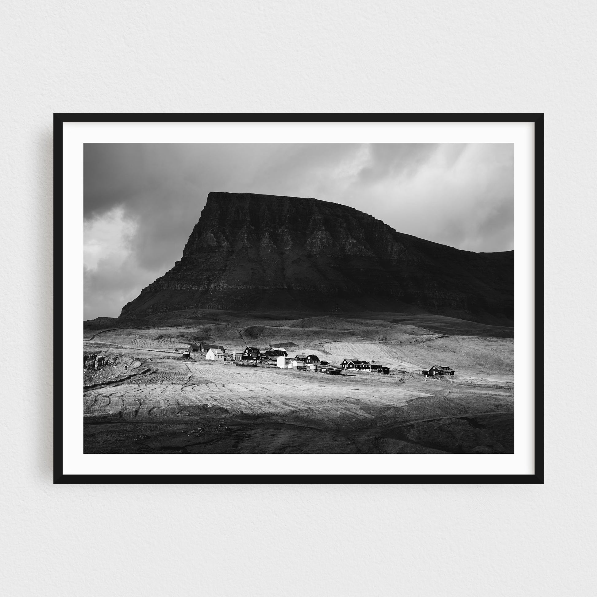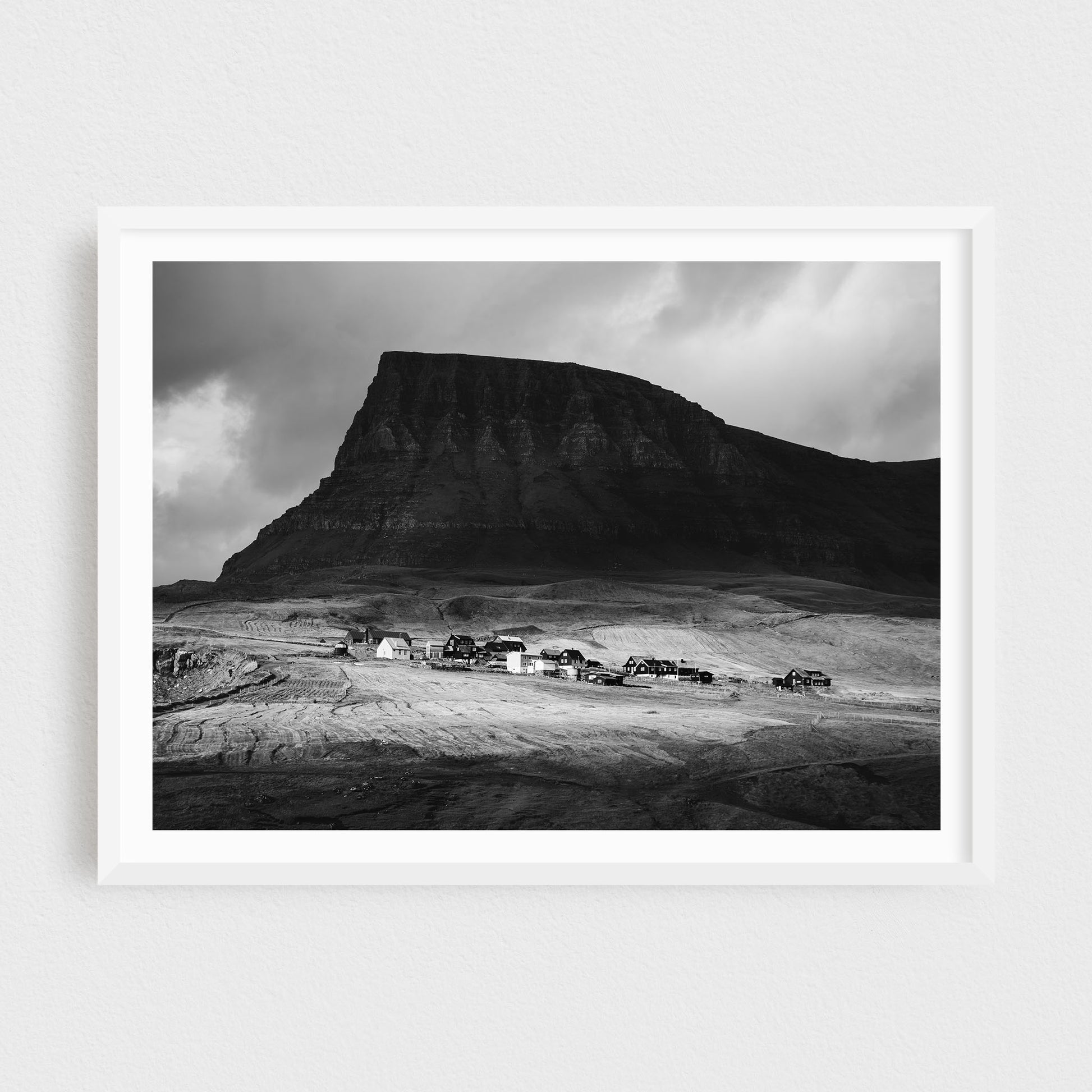 Nestled beneath towering cliffs, Gásadalur Village feels like a step back in time, where simplicity and nature coexist in harmony. This print captures the timeless charm of this remote haven, a place where the wild ocean meets rolling green pastures.