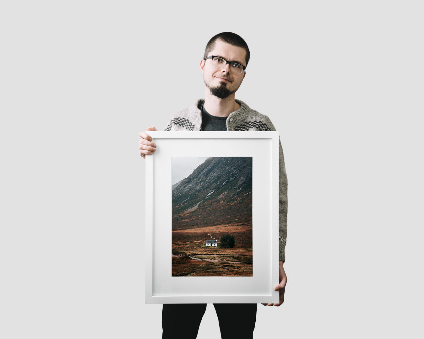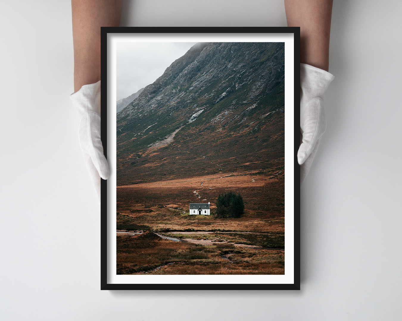 Luxury, museum-quality landscape photography print by Adam Biernat. It features a lonely white cottage in Glencoe, Scotland, showcasing the stunning beauty of the Scottish landscape.