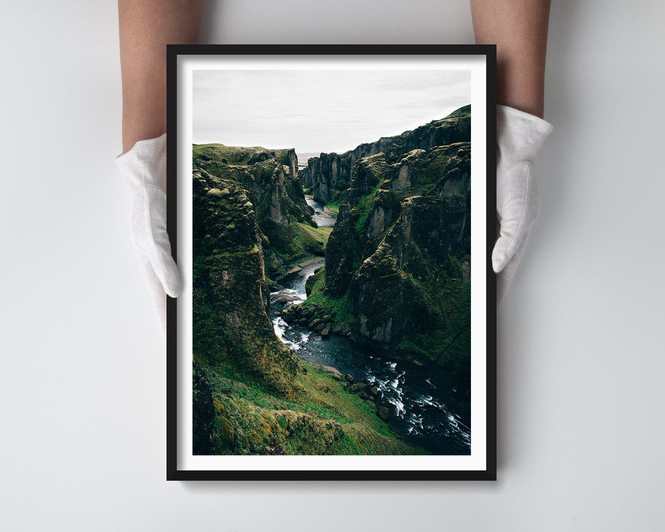 Luxury, museum-quality, real fine art photography print (hand-signed in pencil, with a certificate of authenticity) by Adam Biernat, an award-winning photographer published in the top Icelandic magazines. It features an incredibly green canyon of Fjaðrárgljúfur, showcasing the stunning beauty of the Icelandic landscape.