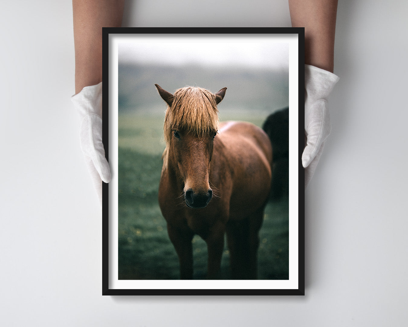 Luxury, museum-quality, real fine art photography print (signed by the artist, with a certificate of authenticity) by Adam Biernat, an award-winning photographer published in the top Icelandic magazines. It features a portrait of an Icelandic horse.