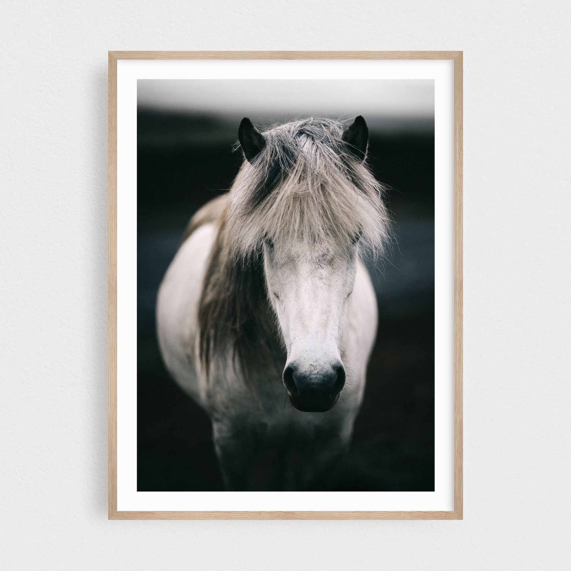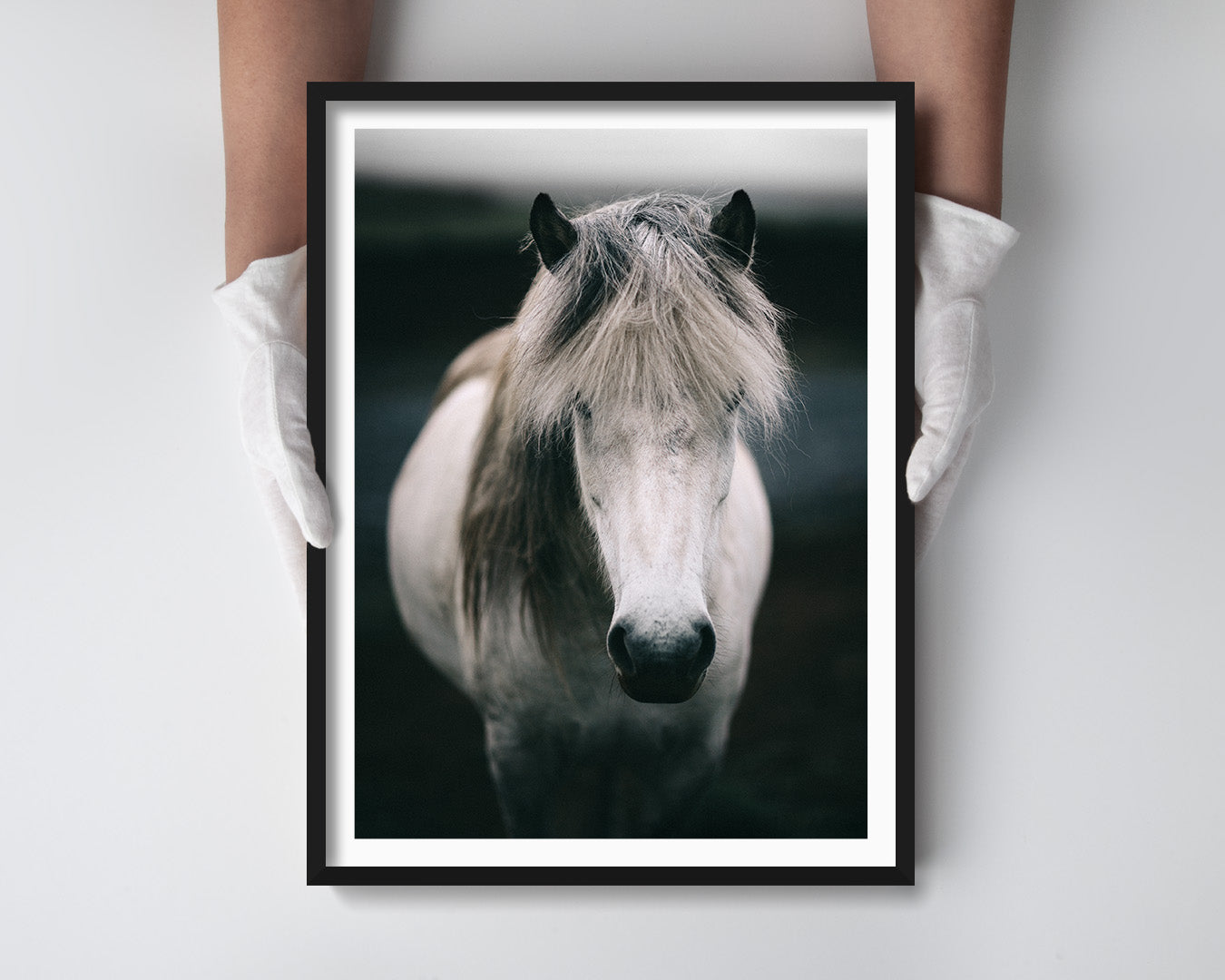 Luxury, museum-quality, real fine art photography print (signed by the artist, with a certificate of authenticity) by Adam Biernat, an award-winning photographer published in the top Icelandic magazines. It features a portrait of an Icelandic white horse.
