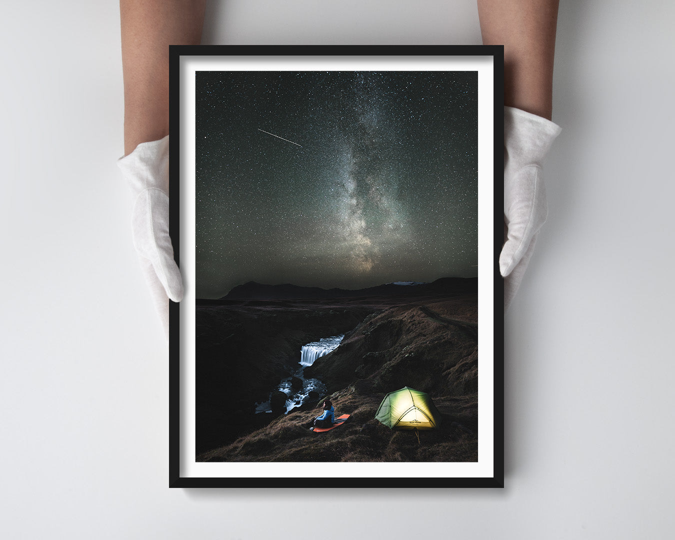 Luxury, museum-quality, real fine art photography print (signed by the artist, with a certificate of authenticity) by Adam Biernat, an award-winning photographer published in the top Icelandic magazines. It features a lonely hiker, camping by a waterfall on Fimmvörðuháls hiking trail in Iceland. Take note of the Milky Way, and a shooting star.