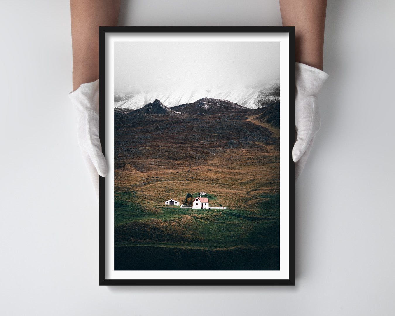 Luxury, museum-quality, real fine art photography print (signed by the artist, with a certificate of authenticity) by Adam Biernat, an award-winning photographer published in the top Icelandic magazines. It features an old, rustic farmhouse located on the slope of a spectacular steep mountain in Öxnadalur, Iceland.