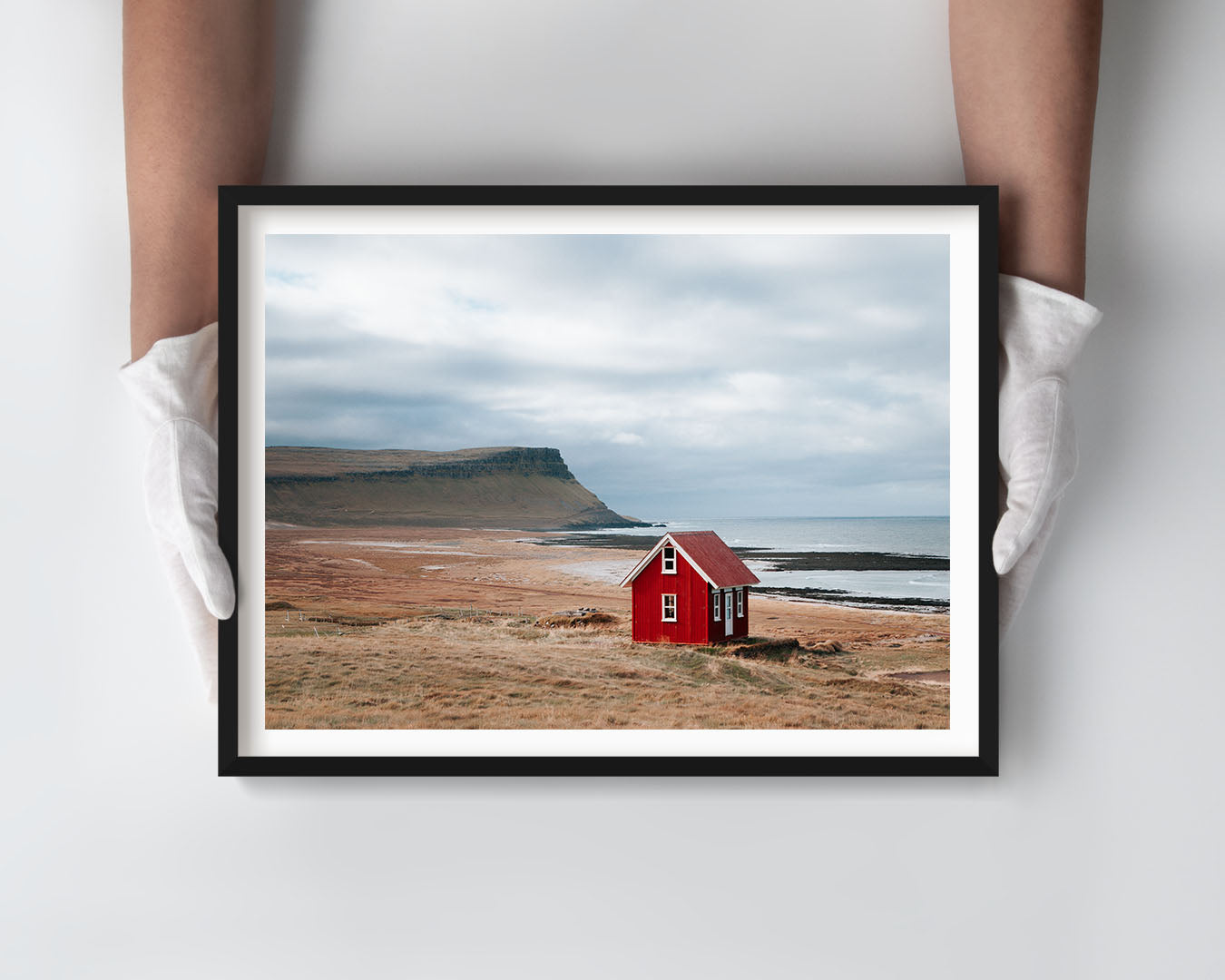 Luxury, museum-quality, real fine art photography print (signed by the artist, with a certificate of authenticity) by Adam Biernat, an award-winning photographer published in the top Icelandic magazines. It features a red cabin in Ásgarður, Iceland.