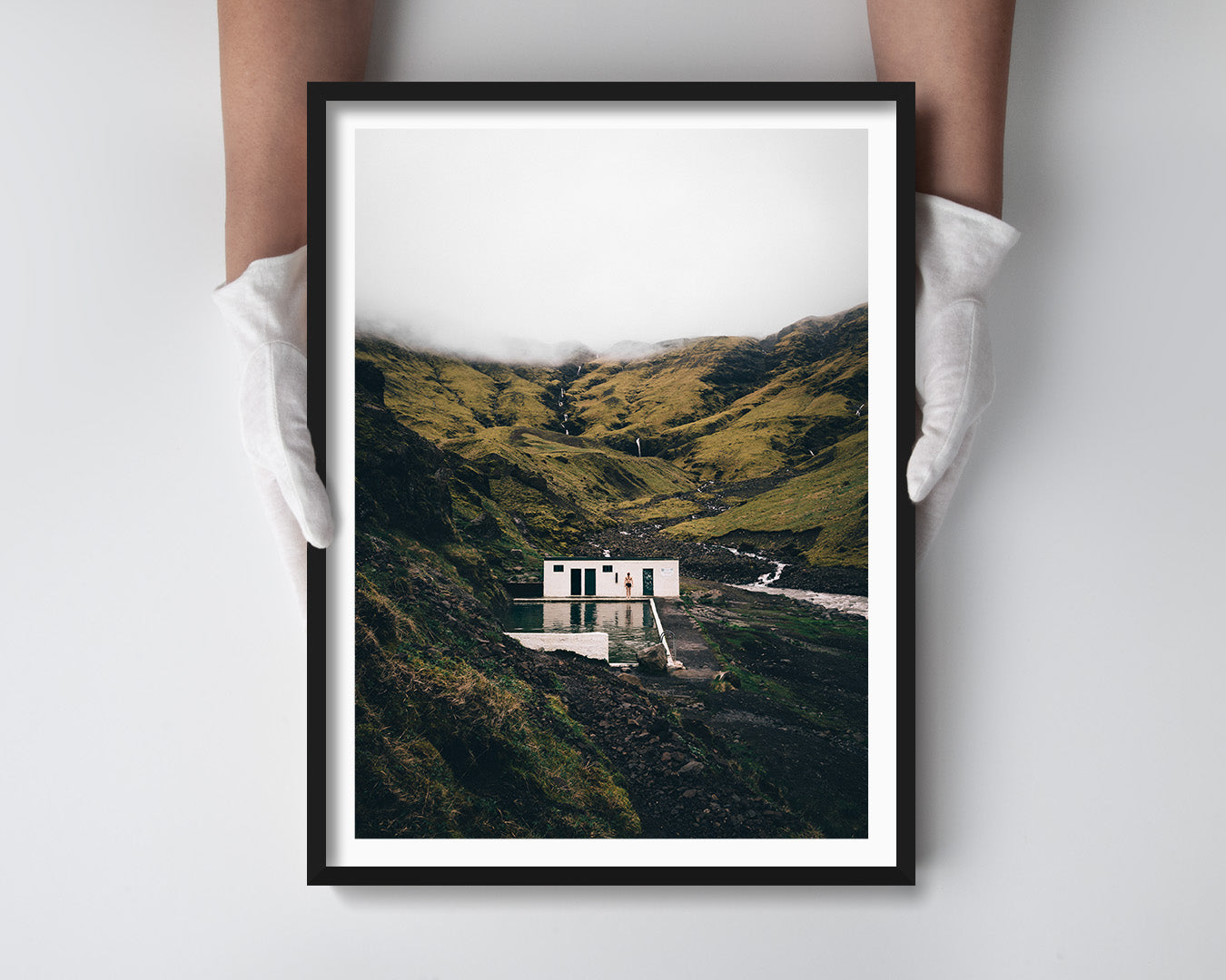 Luxury, museum-quality, real fine art photography print (signed by the artist, with a certificate of authenticity) by Adam Biernat, an award-winning photographer published in the top Icelandic magazines. It features the abandoned swimming pool of Seljavallalaug, set in a jaw-dropping mountain scenery.