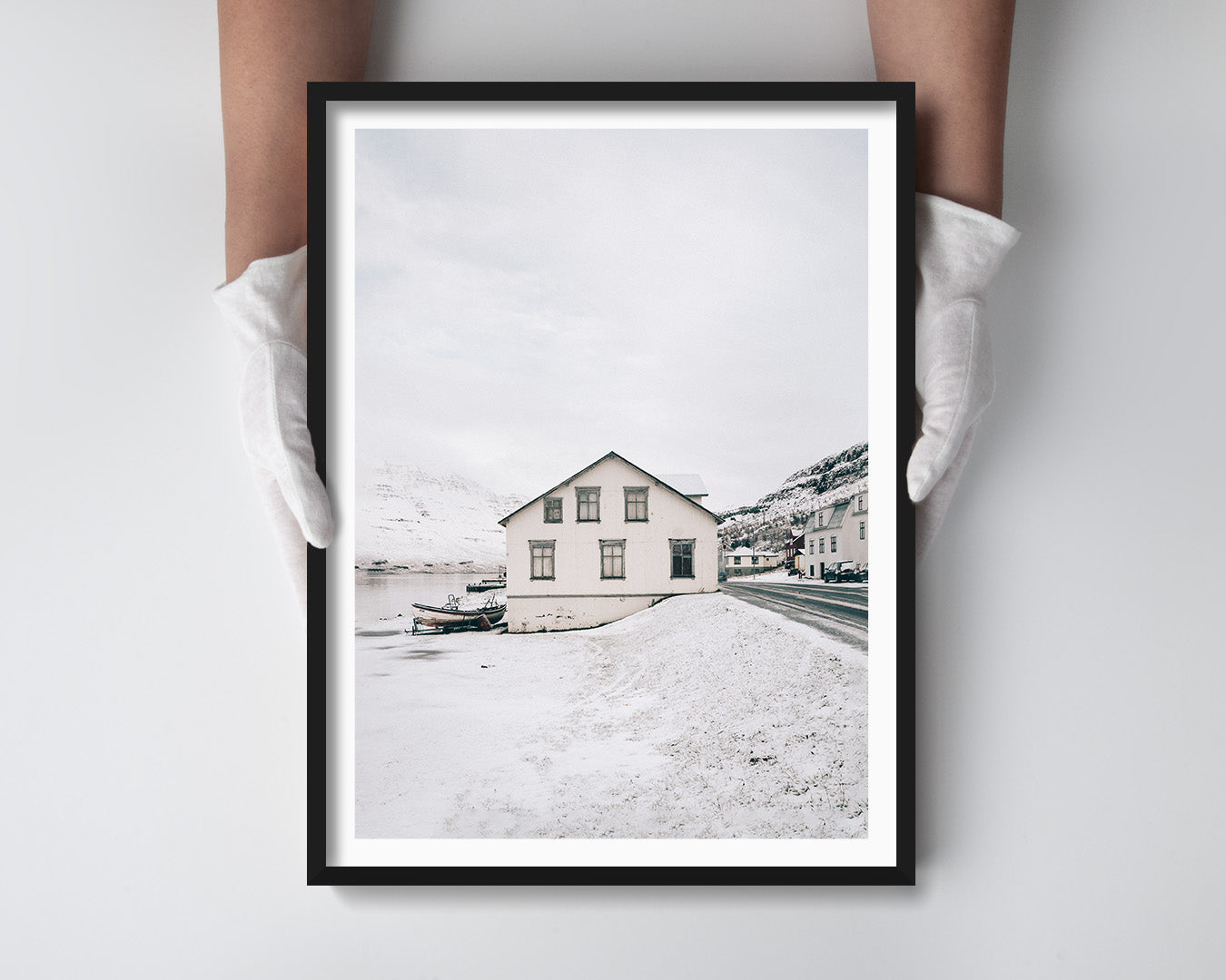 Luxury, museum-quality, real fine art photography print (signed by the artist, with a certificate of authenticity) by Adam Biernat, an award-winning photographer published in the top Icelandic magazines. It features a white, rustic Icelandic house standing by the fjord in the small fishing town of Seyðisfjörður.