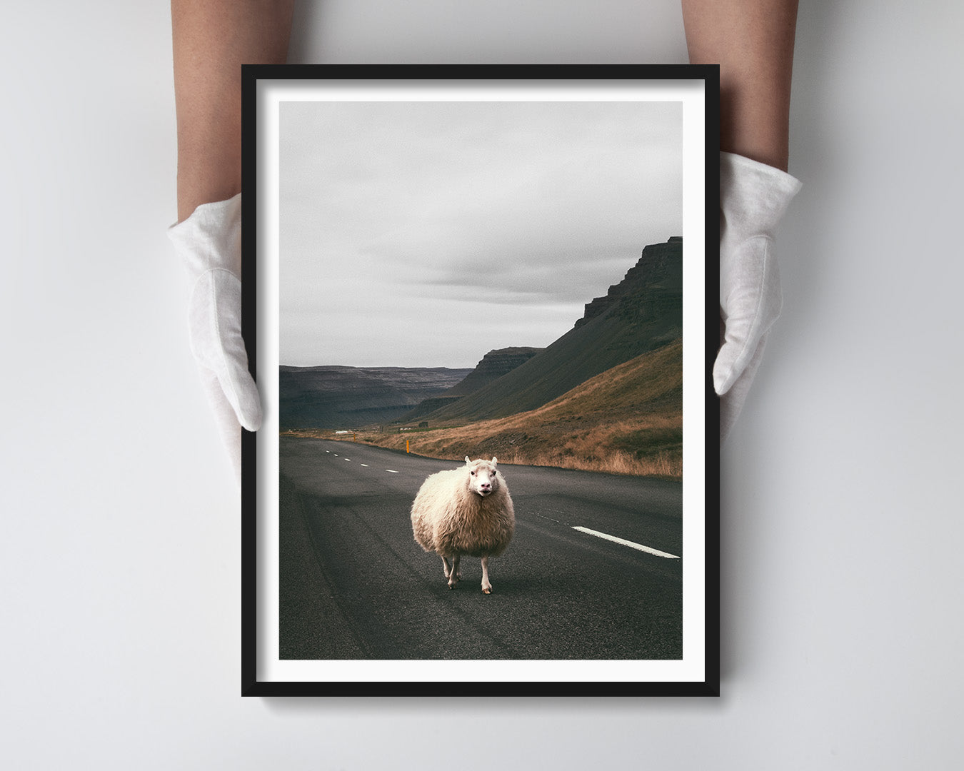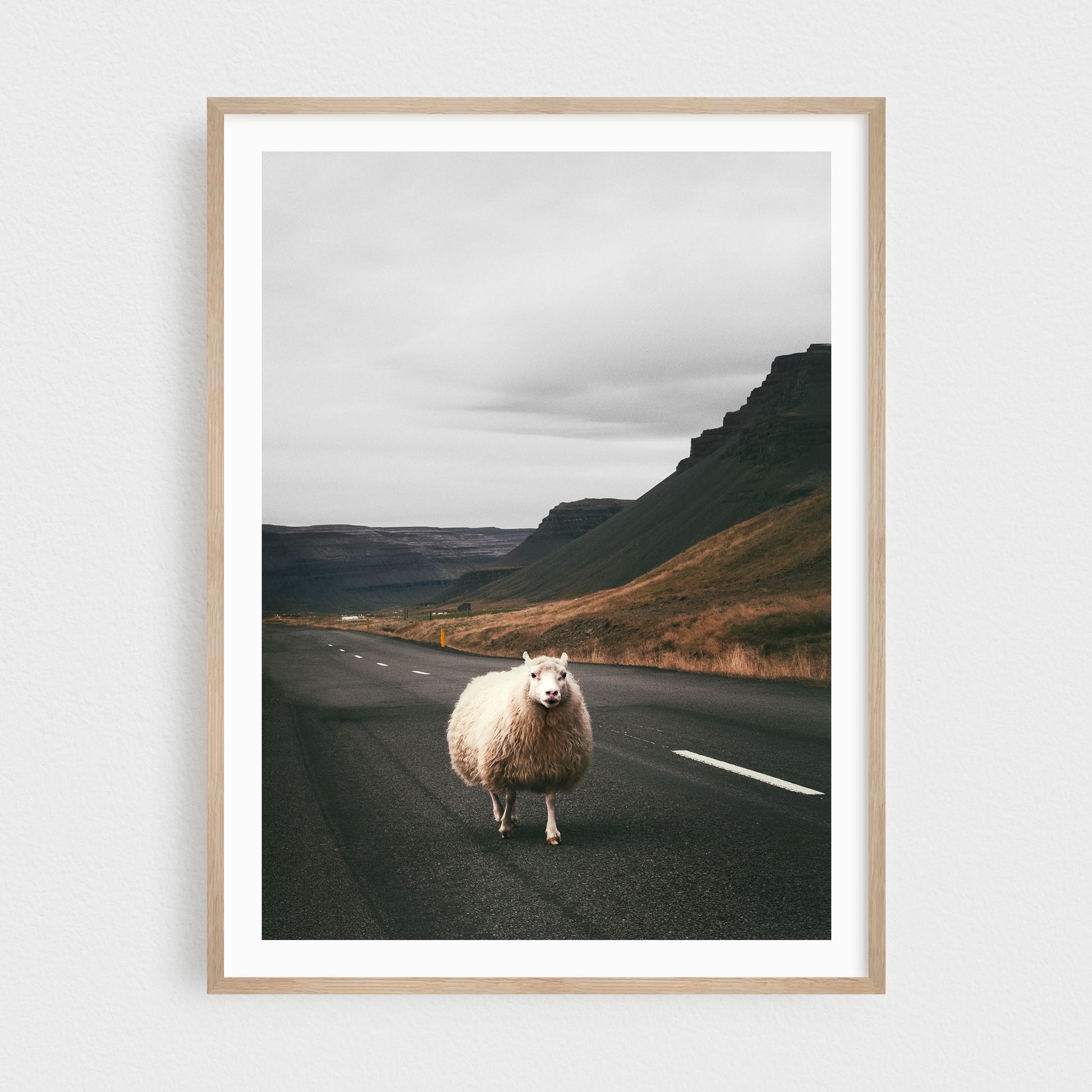 Luxury, museum-quality, real fine art photography print (signed by the artist, with a certificate of authenticity) by Adam Biernat, an award-winning photographer published in the top Icelandic magazines. It features an Icelandic sheep walking in the middle of the road in the Westfjords.