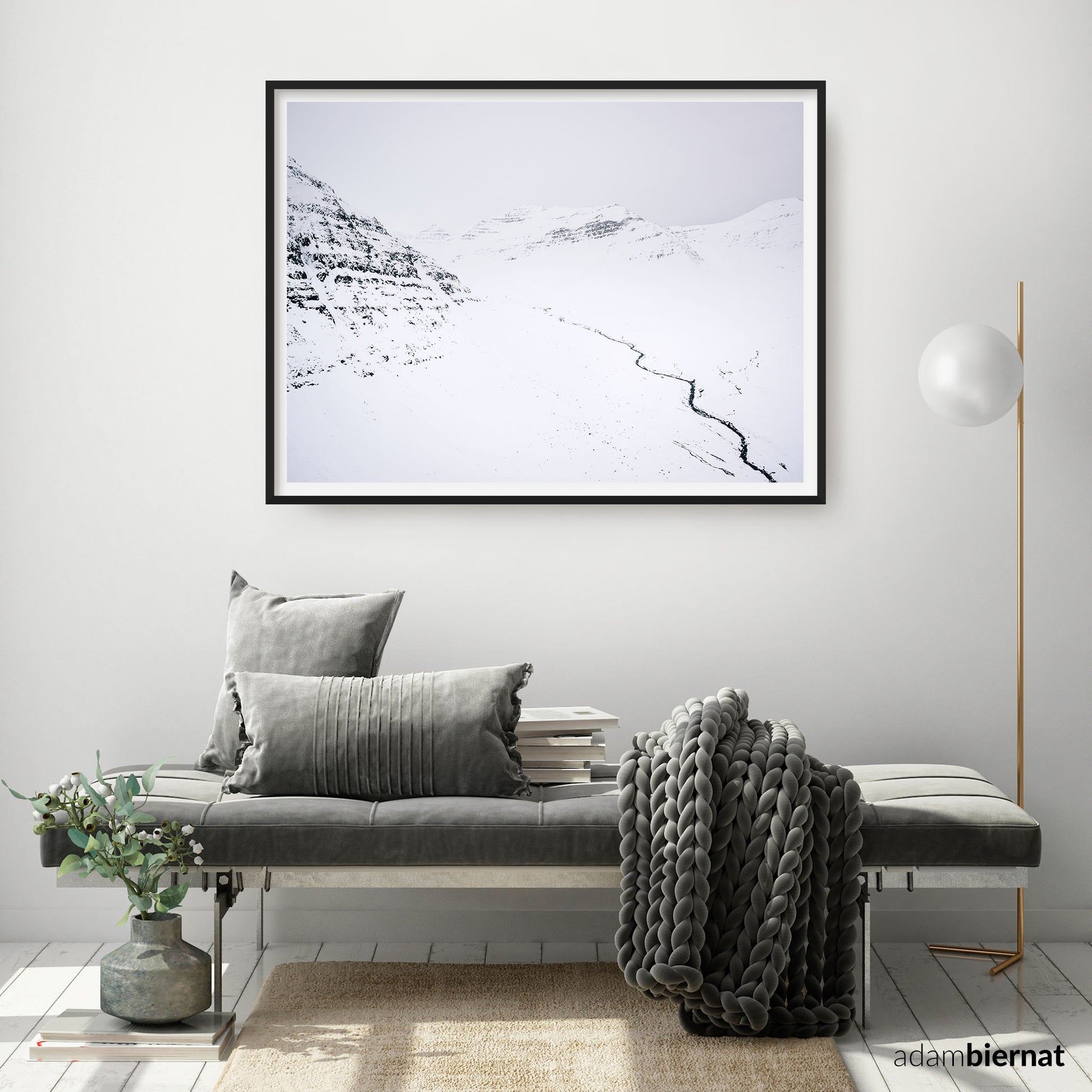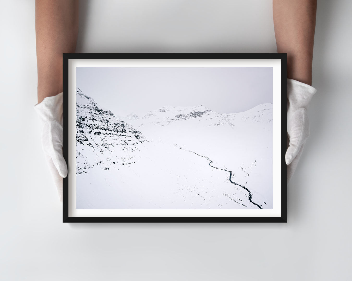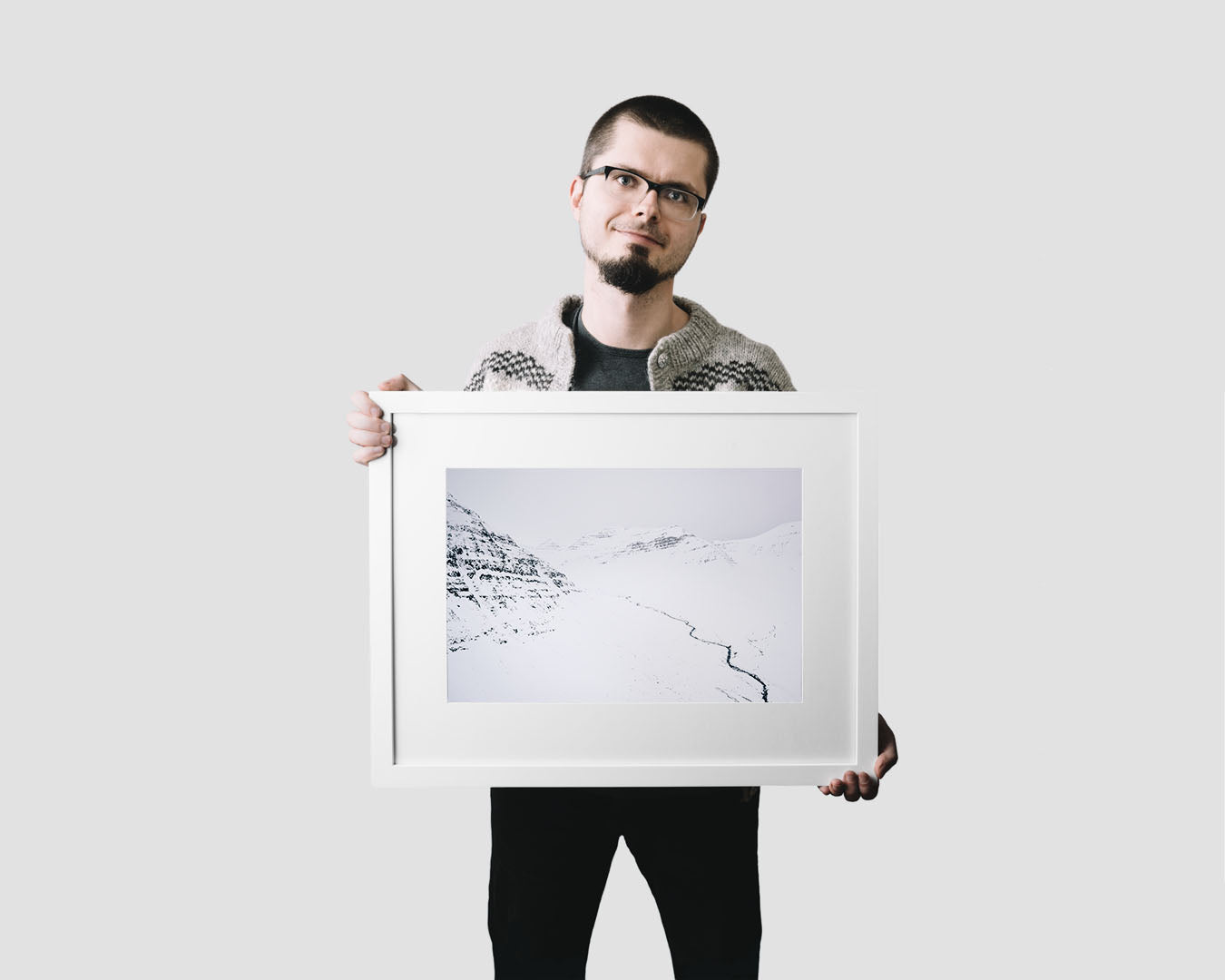 Luxury, museum-quality, real fine art photography print (signed by the artist, with a certificate of authenticity) by Adam Biernat, an award-winning photographer published in the top Icelandic magazines. It features the snow-covered mountain of Ytrárfjall in North Iceland.